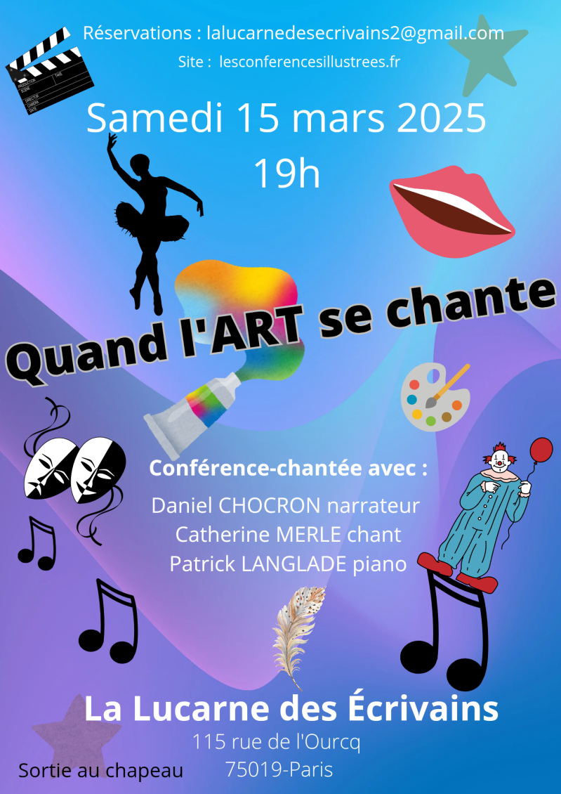 Le 7 FÉVRIER 2025 à 19h30 au CONNÉTABLE ce sera la première de "Quand l'art se chante" avec Daniel CHOCRON (narrateur), Catherine MERLE (chant) et Patrick LANGLADE (piano). À cette occasion nous verrons comment l'art s'exprime à travers la chanson.