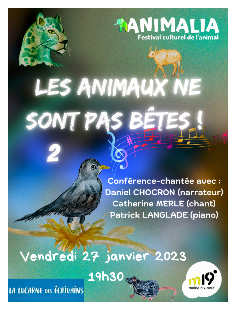 LES ANIMAUX NE SONT PAS BÊTES 2, deuxième conférence illustrée spécialement conçu pour le Festival ANIMALIA 2023 à la mairie du XIXème à Paris, avec des chansons sur le animaux.