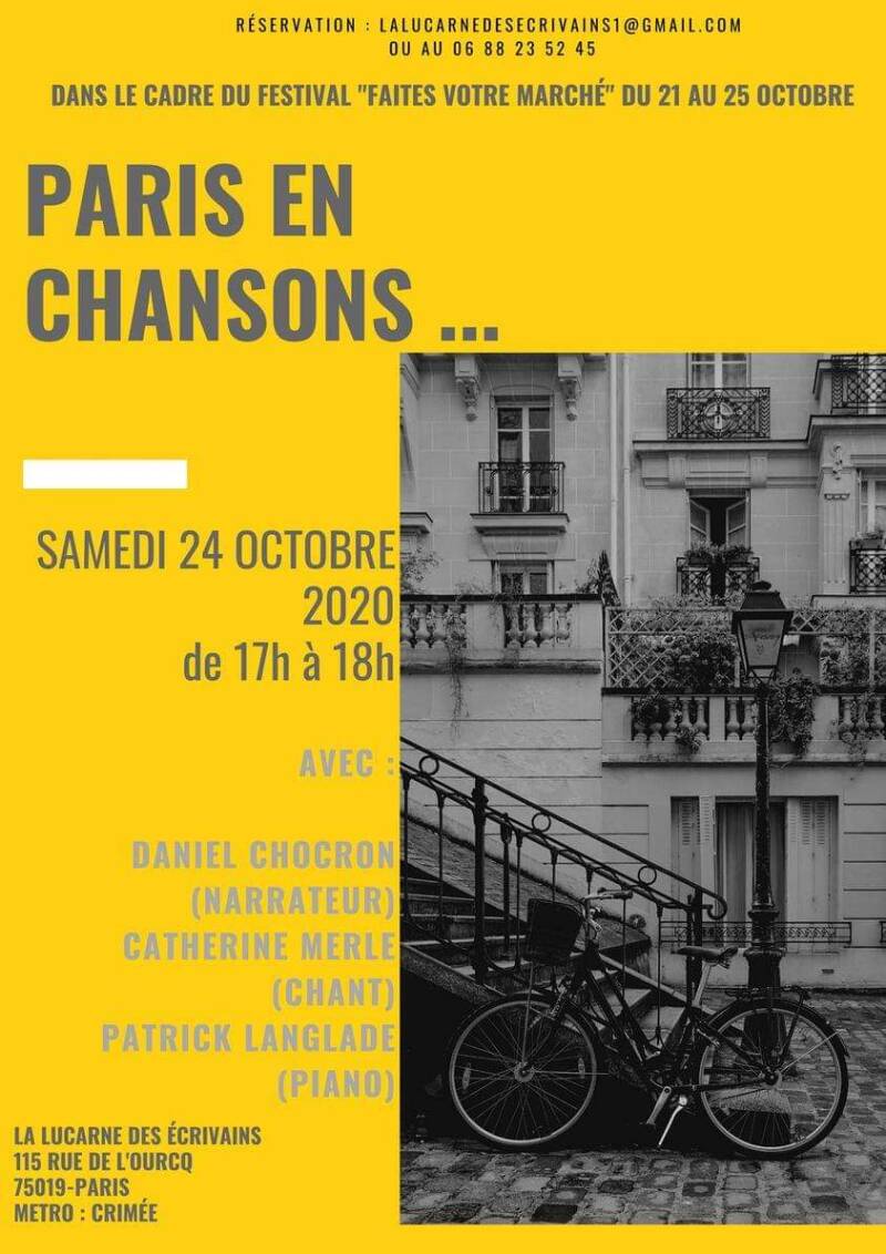 PARIS EN CHANSONS est une conférence illustrée en hommage à Paris à travers ses hauts lieux culturels, touristiques et symboliques. Ainsi Daniel CHOCRON, historien du cinéma et de la chanson, évoque Paris : ses ponts, la Seine, les kiosques, les bouquinistes, ses passages, ses théâtres et ses cinémas, ses jardins, le métropolitain, le temps d'une anecdote, d'un événement historique ou culturel. Le tout agrémenté de chansons (Colette Renard, Gréco, Jacqueline François, Milton, Aristide Bruant, Béart...) reflétant un certain art de vivre tantôt drôles ou émouvantes interprétées par Catherine MERLE, chanteuse, et Patrick LANGLADE au piano.